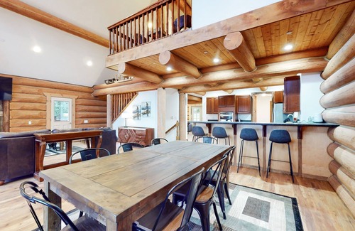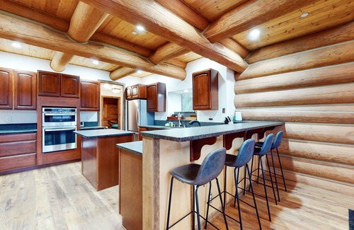 Back at your cabin, walk inside, and discover a spacious main living space. With vaulted ceilings, beautiful wood finishes, and modern amenities, this retreat has everything you need to make it feel like your home away from home. Lounge on the comfortable leather sofas kept warm from the heat of the fireplace, and tune into a movie on the large TV. In the adjacent full kitchen, the chef of your family can show off their culinary skills while utilizing the ample meal prep space, center island, and suite of stainless steel appliances.