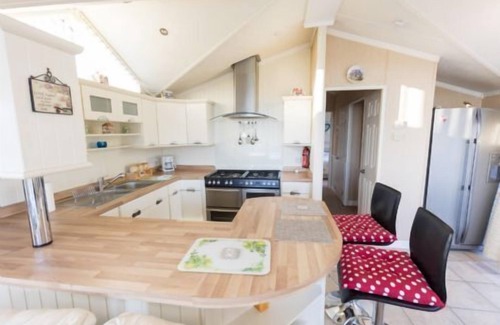 The lodge has lots of space. There's a large, modern stylish kitchen with a range style double cooker, large American style fridge freezer, breakfast bar, washing machine and dining area. Open to the cosy lounge with fireplace and TV. Double aspect doors leading out to the terrace where you can enjoy a drink and the late evening sunshine.