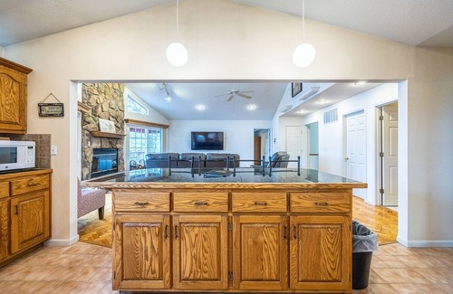 Inside, the house boasts an open-concept layout designed for relaxation and connection. The fully stocked kitchen flows seamlessly into the inviting living area, where vaulted ceilings and expansive windows frame the lake's natural beauty. Enjoy meals at the breakfast bar or adjacent dining area with seating for six. The main level features a spacious primary suite with a queen bed, more stunning lake views, and an ensuite bathroom with double sinks, a walk-in shower, and a soaking tub. A second queen bedroom, another full bathroom, and a large laundry room provide additional space and convenience. The lower level offers even more space to gather with a large family room, making it the perfect spot for games or simply unwinding. This level also includes a full bathroom and 3 well appointed bedrooms: one with a king and a twin, another with a queen and a twin over full bunk, and a third bedroom featuring a twin and another twin over full bunk.