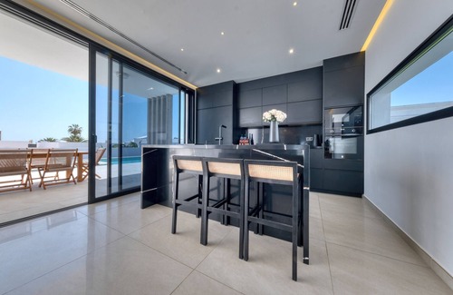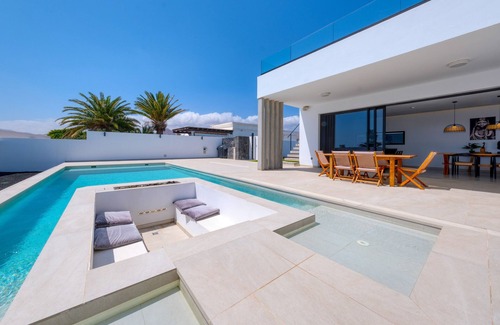 Discover White House Villa, a contemporary design refuge located in Puerto Calero, one of the most sophisticated and exclusive enclaves in Lanzarote. A villa designed for those seeking a luxury experience, absolute privacy, and a unique connection with the island's natural environment. With modern architecture and pure lines, this property has been designed to seduce from the first moment. Its interior spaces open to the outside, integrating light, sea, and nature in every room. Discover an elegant living room where comfort and style meet, with centralised air conditioning for hot days. The comfortable sofas and chaise longues invite relaxation, while modern design details complete a relaxing and welcoming atmosphere. With a spacious living area open to the exterior, this space is bathed in natural light thanks to its sliding glass doors that perfectly connect with a private terrace and a spectacular pool. As a special detail, beneath the flat-screen television is an elegant artificial fireplace, perfect for adding a cosy touch on cooler nights or simply creating a stylish ambience. The villa has four elegant double rooms with double beds and three complete bathrooms with shower. One of them also features a bathtub with exterior views, where every detail has been carefully selected. The kitchen, fully equipped with everything necessary, conveys a relaxed luxury atmosphere, comfort, and practicality, ideal for enjoying holidays without compromising style and good taste. It is a space designed for both cooking and socialising, sharing moments in a sophisticated environment. The heart of White House Villa is its spectacular outdoor area: an impressive solarium surrounds the heated pool, whose uniqueness lies in the central fireplace creating a magical atmosphere as night falls. The chill-out area completes this space designed for relaxation and sensory enjoyment. The pool also has an automatic cover that guarantees the ideal temperature and greater safety. On the upper floor, a second solarium offers spectacular views of the sea, Fuerteventura Island, and Lanzarote's mountains. This upper terrace becomes the perfect spot to contemplate the sunrise or bid farewell to the day with a drink at sunset, surrounded by natural beauty in all directions. For an even more complete experience, the villa is equipped with a surround sound system both inside and in the pool area, with Bluetooth connectivity to enjoy your favourite music at all times. Additionally, this spectacular villa has an extra apartment on the ground floor. It consists of a living room with a fully equipped American-style kitchen, an extra bathroom, and two bedrooms, thus increasing the villa's capacity to 12 people. The booking of this apartment is subject to an extra supplement. From any corner of the villa, one can contemplate one of the greatest privileges of this property: incomparable views of the horizon and dream sunsets, where the sky is dyed with warm colours over the Atlantic. Puerto Calero, with its exclusive marina, gourmet restaurants, and select boutiques, is just a few minutes away, offering the best of coastal life with the tranquillity of a reserved and sophisticated environment. White House Villa is not just a place to stay; it is a lifestyle. A modern oasis in Lanzarote designed for those who understand that luxury resides in the small, great details. The pool is heated and included. Bed linen and pool towels included.