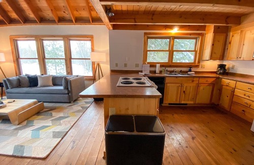 The White Pine Chalet features a modern Nordic design aesthetic and an incredibly cozy layout. Wood burning fireplace, meadow views from the screened-in porch, and brand new furnishings from top to bottom. The main level features a king suite with a walkout and an adjacent bathroom. The expansive screened-in porch has a formal dining and lounge space, perfect for an evening dinner in the Summers or stargazing in the great northwoods. The fully-stocked kitchen is perfect for entertaining your guests. The living room has a smart TV with a Bose bluetooth soundbar, a wood-burning fireplace, and a memory foam sleeper sofa for a fifth guest. Up the stairs is a queen lofted bedroom with lounge space, bathroom, and a yoga/work room.