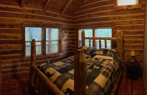 Whitetail Lodge is a beautiful two-storylodge located between our two ponds. It sits deep in the forest and has a wraparoundporch to relax on both levels. This cabin and its peaceful setting is perfect for a large family. It'sour largest and most spacious cabin on the property.Whitetail Lodge is truly the perfect place to hideaway from the world as you view either of our lakes from your rocking chair on theporch. Enjoy a family dinner in the spacious kitchen and dining area. Finish the day with games and family fun in the game room!Don't be surprised if a curious deer or duckmakes its way across the lake damn. We have an abundance of wildlife,and this cabin offers the perfect place to view it!