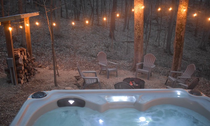 The cabin has a great outdoor space! Enjoy nature and wildlife from the porch swing and rocking chairs on the covered front porch, or roast hot dogs and S'mores around the backyard fire pit from the Adirondack chairs (firewood provided). If grilling is more your outdoor cooking style, the cabin also offers a Blackstone griddle, which is perfect for cooking any meal. To top off your outdoor experience, grab a glass of wine and head to the back yard 6-person Viking Spa hot tub (with Bluetooth speakers!) nestled under the trees for perfect relaxation.