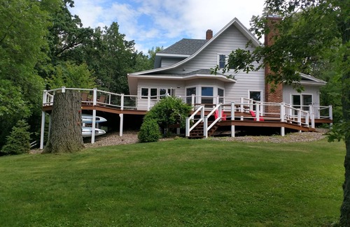 Just what you were looking for!! This is a 5 bedroom 4 bath 3,500 square feet lake home that has lake views from almost every window in the home. There are 3 acres to explore with more privacy then you could ask for. The property is in a deep oak timber, but only 4 minutes from town. Over 200 feet of shoreline on the clearest lake in Polk county WI. This property is perfect for large groups but is just as wonderful for smaller groups as well. Spend your time on the lake water skiing, jumping from the swimming platform, or just relaxing on the dock. Bring your own boat or rent a pontoon from the restaurant right on the lake! Don’t forget your fishing pole as the lake is a great fishery. There are also kayaks, a paddle board, and a small Jon boat available for your pleasure.