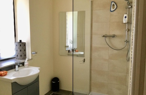 A spacious family bathroom with a shower, heated towel rail and a selection of hand and bath towels.