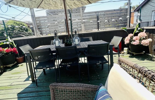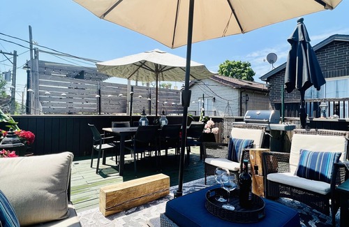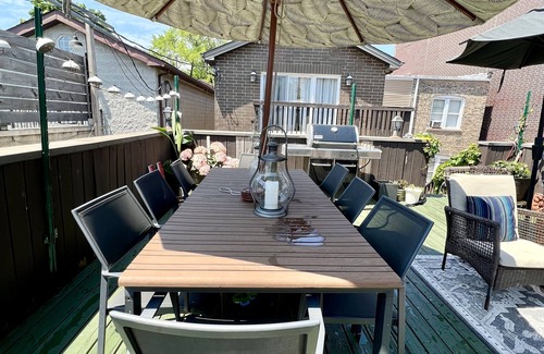 An ideal retreat for special occasions in Wicker Park. This spacious home is a celebration of contrasts. An eclectic style carefully gathers various periods, styles & interesting recycled elements while creating cohesiveness with modern design. A wide and long, open-floor concept in the heart of the city, with three separate floors. An ideal retreat with tons of light, space and privacy should you prefer to close your bedroom. Perfect for a relaxing vacation or special occasion. A fully equipped chef’s kitchen + wet bar + family room leading to your outdoor deck and rooftop garage. The rooftop garage deck is equipped w/ a Weber grill and sectional seating.