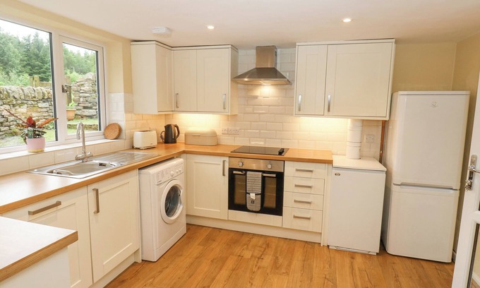 Wigtwizzle Cottages, a cottage consists of a kitchen with electric oven and hob, fridge/freezer, microwave, washing machine, and dishwasher, a dining room with table for eight, woodburning stove, and selection of books, and a sitting room with Smart TV and woodburning stove. The bedrooms consist of a king-size and two twins. There is a bathroom with bath, shower over, and basin and WC. Outside, there is a private garden with lawned area, gravelled area, picnic bench, and barbecue, and private off-road parking for three cars. One well-behaved pet welcome. Sorry, no smoking. Shop 2.7 miles, pub 3 miles, reservoir 0.5 miles. Stay at Wigtwizzle Cottages for your next picture-perfect holiday. Note: Small step up to the bathroom. Note: Dogs allowed downstairs only. Note: No access to garage. Note: Grazing available for horses. Note: This property has a Good Housekeeping bond of 300GBP.