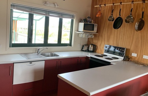 "Thyme Out By The Sea is opposite beautiful Kuaotunu Beach, sixteen kms from Whitianga and by the sea. Enjoy this two bedroomed eco cottage. Beautifully decorated and fully self contained. Fantastic views of beach and also adjoining creek. Kayaks supplied. One bedroom has a queen bed and the other has a set of smaller single bunk beds.