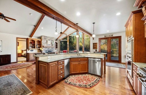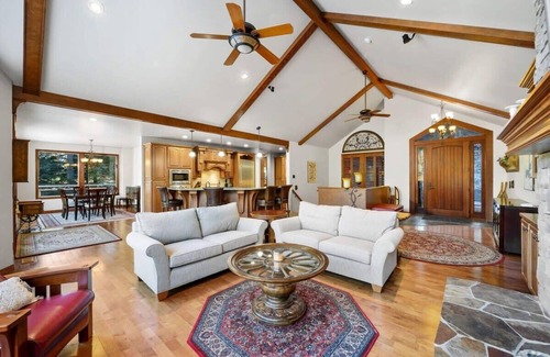 When you enter the beautiful Wildcat Creek Lodge you will be welcomed by all the natural light coming from the floor to ceiling windows. The vaulted ceilings are lined with charming wooden beams that guide you through the first living room.