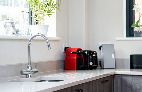 The kitchen is fully equipped with state-of-the-art appliances including a built-in microwave, dishwasher and large fridge freezer. There is an inset induction hob, a Nespresso coffee machine ( pods not provided) and a large island that has two stools for casual breakfasting. The cupboards offer plenty of storage and the property is fully stocked with cooking utensils