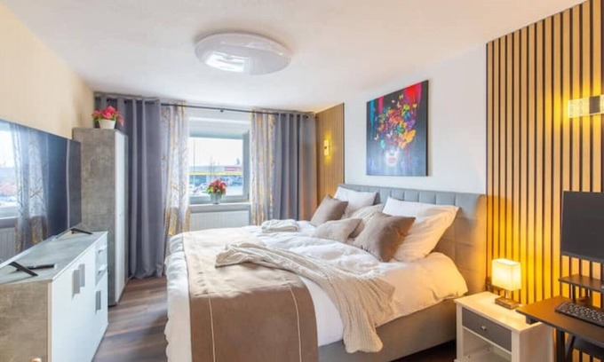 Willkommen bei / G.A.D.D / Ferienwohnung Glück an der Donau / Es erwartet dich eine komplett neu ausgestattete 2-Zimmer Ferienwohnung mit luxiriösem Schlafzimmer, das mit einer harmonischen Einrichtung für entspannte Nächte sorgt. Das Kingsize Bett ist mit hochwertiger Bettwäsche ausgestattet, und die weichen Kissen laden zu erholsamem Schlaf ein. Ein geräumiger Kleiderschrank bietet ausreichend Platz für deine Kleidung, während die dezenten Farben und die geschmackvolle Dekoration eine behagliche Atmosphäre schaffen.