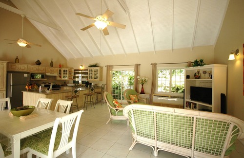 One of the highlights of Wind Dancer is its expansive covered terrace, which offers a perfect spot for outdoor living. Overlooking the private swimming pool and lush garden, the terrace is furnished with comfortable seating and a dining table, making it an ideal space for alfresco meals, evening cocktails, or simply unwinding with a good book.
