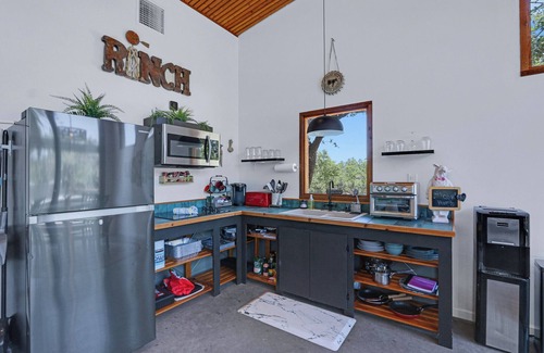 Inside, the casita boasts an open living space, thoughtfully decorated with an eye-catching wall mural that adds a touch of charm to the ambiance. The dining area, set for 4, is perfect for enjoying meals with your loved ones, and the roomy kitchen is fully equipped to prepare quick and delicious meals during your stay.
