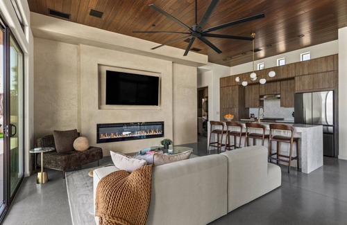 Centered around a private courtyard with a custom in-ground pool and spa, the home's layout embraces indoor-outdoor living. Each bedroom features sliding glass doors that open directly to the backyard, creating a seamless connection between rest and nature. At the heart of the home, the great room soars with tall, dark wood-paneled ceilings, anchored by a modern built-in fireplace and a double-waterfall quartz island clad in Moroccan tile - a bold centerpiece flanked by a chef's kitchen and full bar.