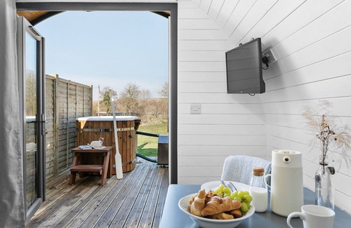 Perfectly proportioned both inside and out, guests will have all the space they need to enjoy time together, with the pod's contemporary interior being well-equipped, spacious and comfortable. There's a sumptuous living room with sofa and TV where you can curl up with a good book and enjoy the views down to the river, as well as a kitchen / dining area for preparing and sharing meals. The bedroom which features a double bed and picture window, has a separate shower room alongside. Treat yourselves to morning lie-ins with the doors open or step out on to the timber deck where you'll be able to unwind in the sunshine with a cup of coffee or breakfast. Designed with relaxation in mind the pod comes complete with its own private wood-fired hot tub, outdoor furniture, and a fire bowl which doubles as an outdoor grill that's perfect for chilled out evenings and al fresco dinners.