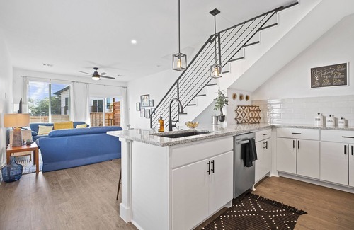 A BRAND NEW built, 3 bedrooms, 2.5 bath, 2 car garage home located in the beautiful lake community of Lago Vista. All bedrooms are located on the second floor with vaulted ceilings, luxurious master bedroom with en suite bathroom and a private balcony with a view that stretches for miles!!! Queen second bedroom with beautiful modern furniture. Queen over Queen loft beds provide enough space for adults. Second full bathroom is also on the second floor, half bath is located on the first floor. Laundry room with full size washer and dryers. Granite counters, solid wood slow close cabinets, backyard with wood privacy fence.