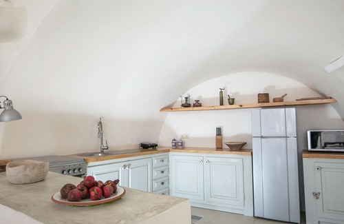 An old Winery renovated and transformed into a very stylish villa with amazing oriental garden and a tiny swimming pool Situated in the peaceful and traditional village of "Finikia" in Oia The Winery House (main domain), part of the "Winery Villa" complex, was the last winery which operated in Fiinikia until the 70's. This impressive construction was built by Santorinian craftsmen using local materials like Aspa (volcanic ash), Poria (red volcanic stones) chipped around the doors and windows, gray and red volcanic stone stairs, traditional doors and traditional concrete floors. Iron railings in all windows were used as protection from the pirates. The building is composed by two interconnected large cave rooms (canavas) of a total 140 sq.m. surface. There was the winery production and the barrels. Both enter from the courtyard where the main entrance to the house is. These canavas with impressive proportions and domed roof, half caved and half external, follow the typology of a large church due to constructional and operational reasons. Build benches along the stone walls used to support the wine barrels. A crypt in the wall that separates the canavas is the "ratsidio" where took place the distillation of raki, is now used as a guard robe. The big open space (of over 80 sq. m.) of the eastern canava includes, the living room with build benches, the dining room, the kitchen and an (open) cave bedroom with a double bed. It looks strange that this house having only two bedrooms is stated for 6 guests. The major bedroom is one entire hall (the western canava) of 60 sq.m This includes the master bedroom with one build-in Kings size bed, and above it, a wooden (open) loft with two single sleeping mattresses. Both rooms are decorated in high style. Both chambers (canavas) are open to a large "oriental garden' of 250 sq.m full of flowers, trees and wine plants, shared with a small studio, (guest house), called "House of the singing birds". Each house has it's own private space and terrace. A tiny swimming pool lies in front of the "Wineryhouse", meant exclusively for it's guests. The fully equipped kitchen in combination with the oriental garden make this place ideal for preparing and enjoying great gourmet dinners indoors, or out doors.