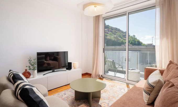 The apartment includes three bedrooms: one with a double bed, balcony, and private bathroom; a second with a double bed; and a third with two single beds. There is also a second full bathroom, ideal for sharing among guests. The living room is spacious and bright, with a sofa bed and direct access to the balcony. The kitchen is fully equipped for both short and extended stays.