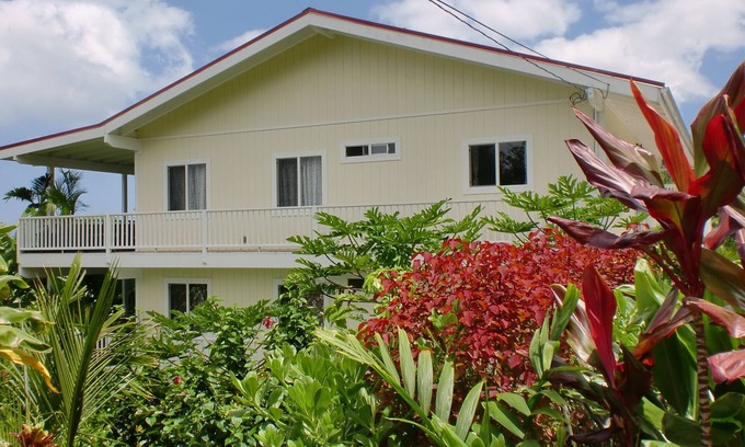 This lovely, spacious (300 sq. ft.) studio with large covered lanai and tropical garden view is one of several studios at Bears' Place Guest House in Kailua Kona, Hawaii. Wake up in the morning to birds singing and pick bananas from your lanai. Our studio has a comfortable queen bed, sleeper sofa, kitchenette, brand new bath with extra large shower, and cable TV. We offer free WiFi, convenient onsite parking, beach chairs/towels, coolers & boogie boards. Great central location, on the hillside overlooking the Kona Coast, 7 miles north of downtown Kailua. 10 minutes from airport (no noise) for those late flights. Owners have been hosting Big Island visitors for over 30 years, speak German, and are happy to share suggestions and answer questions if guests desire.