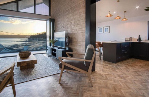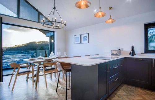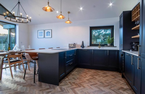 A stunning exposed brick wall separates the living space from the top-of-the-line kitchen and dining area. The contemporary kitchen is fully equipped with a fridge/freezer, dishwasher, oven, and hob, ensuring you have everything you need for a stress-free stay. The elegant dining table comfortably seats six and also features bifold doors that open onto the same balcony, allowing for seamless indoor-outdoor dining while you soak in the beautiful coastal scenery.