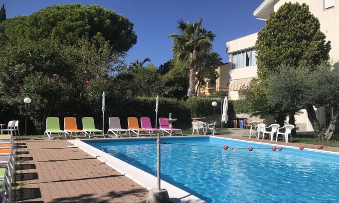 This well-maintained residence is nestled in a quiet location, approximately 1,000 to 1,200 meters from the sea and the center of Loano, surrounded by a beautiful park and garden. Restaurants and shops are within easy walking distance. The complex consists of a main building and a smaller annex. The apartments have been partially renovated and most have a balcony or garden. The apartment offers approximately 40 square meters of living space and is ideal for four adults and up to two children (up to 16 years old). It features a bedroom with a double bed and an additional single bed, as well as a living room with a sofa bed and a single bed – some also with a bunk bed. Some units have a furnished terrace or a small garden area (dehor). Amenities include a bathroom with a shower or bathtub and toilet, a kitchenette with a gas stove, a refrigerator with a small freezer compartment, a microwave, satellite TV, air conditioning, and heating. A communal pool is available from April until around the end of September (weather permitting), as is a tennis court on site – ideal for family holidays on the Italian Riviera.
