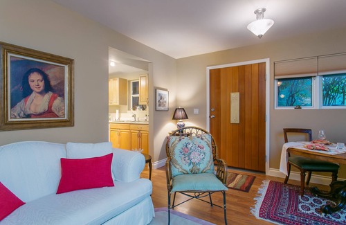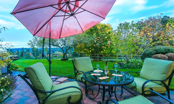 Beautiful and spacious, this 1000 sq. ft. private suite enjoys southern exposures overlooking the gardens and meadows of WolfShire. Enjoy your afternoon coffee while you watch our donkeys grazing in the fields against a backdrop of snow-capped mountains on the Olympic Peninsula. The Sunrise Suite has been designed and appointed with attention to details that will make your stay unforgettable. There is a comfortable living room, bright and open with a cozy fireplace and a relaxed dining space leading to your private patio. The patio is equipped with a BBQ for your culinary adventures and a outdoor dining set so you can sit and watch the colours of the sun setting as you enjoy a glass of wine. Comfort and relaxation have been the key words for the design and execution of this unique property.