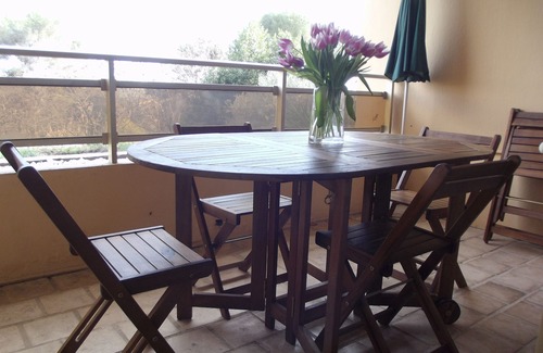 Our charming one bedroom apartment,which has been rated 4 star by Etoiles de France, the ufficial French Tourist Board, (and they check absolutely everything, includind crockery, utensiles,linens, pillows, etc.) has two terraces with stunning views of Marina Baie des Anges, and the Mediterranean towards Nice, and tranquil views of the park at the back. It is fully air conditioned, has Wi-Fi, satelite TV, private parking, is in a gated community with a large swimming pool, beautiful gardens, and a tennis court, just a 10 minute walk from the Mediterranean. Sleeps 3 adults, with one bedroom, and a comfortable pull down bed in the lounge. The train station and bus stop are less than a ten minute's walk. The charming old town of Antibes, is a five minute drive, with it's typical covered Provençal market, lovely beaches, great restaurants and, of course, the Picasso museum. Nice is about a 20 minute drive, Cannes about a 30 mins, it is in an ideal position for exploring the famous towns along the coast, from Monaco to Cannes, Villefranche, Beaulieu, Roquebrune, and Eze, or inland to one of the delightful Provençal villages, such as Valbonne, Biot, St Paul de Vence, for a quiet lunch, or further afield the Gorges du Loup, or Italy. There are also many museums including the Matisse chapel, the casino at Monte-Carlo, a beautiful landscaped outdoors shopping mall, and another indoors one, both just a few minutes drive away. If you’re a tennis fan you can hop on a train which will take you right into the Monte Carlo Country Club for the Rolex Masters, or to Monaco for the F1 race. So there’s plenty to do whatever season you choose to visit this beautiful, and glamorous part of the world. Although everything is within easy reach, the residence is beside the Vaugrenier Park, so a wonderfully calm retreat at the end of a busy day.