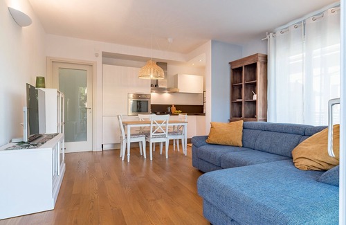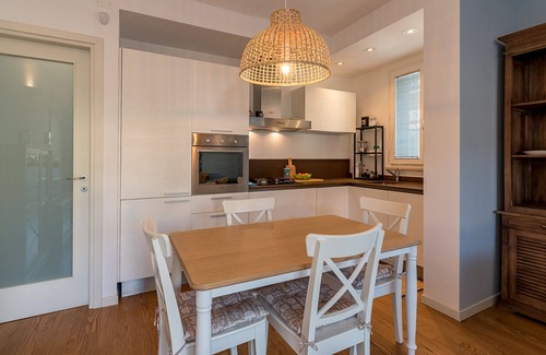 Bright and welcoming 90m2 apartment 500 meters from the sea and Viale Dante, equipped with lift and private garage. It is composed of a large living room with large habitable balcony with table and chairs for eating and sofa for relaxing, two double bedrooms with relaxation terrace and two bathrooms with shower. Furnished and equipped with all comforts: air conditioning, WiFi, Washing Machine, Dishwasher, SmartTV. It has large balconies for outdoor dining. It is especially recommended for families, even with small children. Bicycles are available; Rimini airport 5 km away.