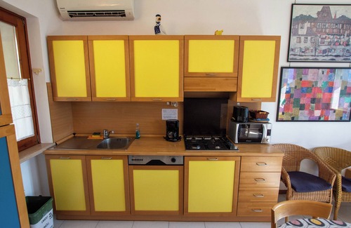 The fully-equipped apartment consists of a living room (with sofa, two armchairs, TV), a dining area (with table and chairs), a kitchen (with a stove, dishes, pots and pans, and a German or Italian coffee machine) , bathroom (with toilet, sink, bidet, shower and washing machine), a bedroom with double bed and a bedroom with a single bed and a double bunk bed.