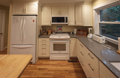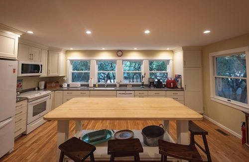The open concept main level features a huge, fully and well equipped gourmet kitchen with lots of windows, Quartz countertops, fully stocked built in pantry, french door refrigerator with freezer and icemaker below, and a custom made center island "table" for everyone to participate in the food preparation, and for casual meals. A huge dining room with wood burning fire place for chilly fall days and built in bookcases. The space flows into the spacious Cathedral-ceilinged living room with a huge screened dining porch on one side, and an open sundeck surrounded by trees, with Adirondack chairs in the back.