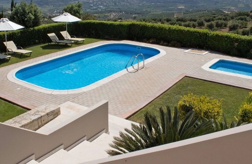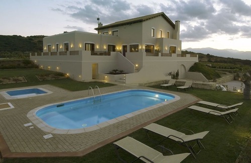 Large, beautiful, comfortable villa "Country Luxury Villa", built in 2008, renovated in 2015, surrounded by vineyards. In the district of Houdetsi 9.7 km from the centre of Archanes, in a secluded, quiet, sunny position on top of a hill, 21 km from the sea, 21 km from the beach. Private: large garden with flowers and trees, lawn for sunbathing, swimming pool (40 m2, seasonal availability: 01.Apr. - 30.Sep. pool opening hours: 08:00-20:00). Volleyball, barbecue, parking (for 5 cars) at the house. Grocery 1.7 km, supermarket 1.7 km, restaurant 1.7 km, bakery 1.7 km, café 1.7 km, sandy beach "Karteros" 21 km. Nearby attractions: Labyrinth Musical Workshop 1.9 km, Archaeological Museum of Archanes 11 km, Folklore Museum of Archanes 11 km. Please note: car recommended. Suitable for families, baby equipment on request (included). Groups of teenagers on request only. Suitable for events.