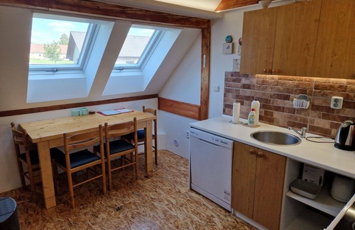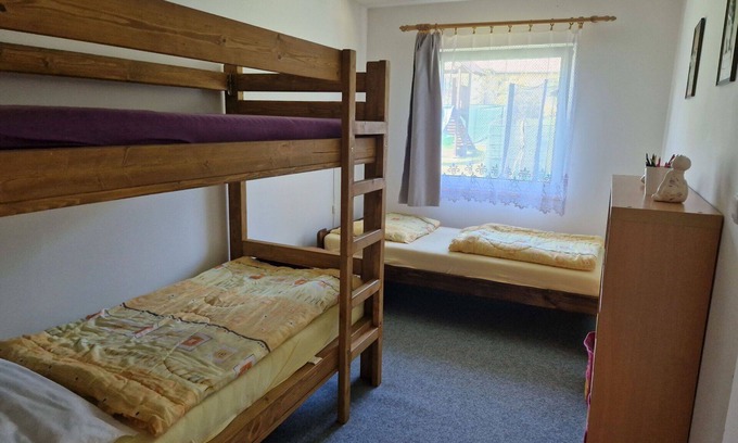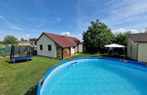 Velký Ratmírov is a cosy detached bungalow situated in a tranquil and sunny location in Soběslav, Czech Republic. The private, fenced property spans 100 m2, featuring a seasonal above-ground swimming pool (available from June 1 to September 30), a yard with garden furniture, a barbecue area, and a children's playground, making it an ideal vacation rental for families.