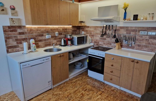 The house is well-appointed with modern amenities, including a fully equipped open kitchen with an oven, dishwasher, four ceramic glass hob hotplates, a kettle, microwave, and an electric coffee machine. You can enjoy your meals in the designated kitchen corner. The house also offers a shower and a separate toilet for added convenience. Heating is provided through a wood heating system.
