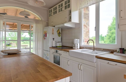 You will enjoy a spacious and bright 3-room house that spans 120 square meters on the ground floor. The tasteful furnishings include a large living/dining room with a double sofabed, an open-hearth fireplace, a TV, and air conditioning. The living/dining room has an exit leading to the garden and terrace. One room features a French bed (140 cm) and also has an exit to the garden. Another large room has a double sofabed, a shower, a bidet, and a toilet, with an exit to the garden. The open kitchen is equipped with an oven, a dishwasher, four induction hot plates, a toaster, and an electric coffee machine, and it also has an exit to the terrace. There is an additional shower, bidet, and toilet in the property.