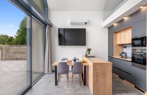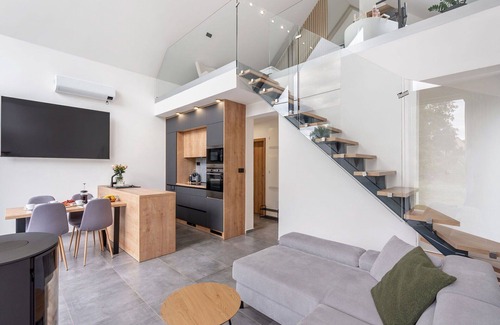Situated in Prostý, Czech Republic, this modern and luxurious holiday development consists of three houses within a well-maintained resort. The property offers essential amenities including complimentary Internet WiFi access, convenient on-site parking, and an EV charging station for environmentally conscious travelers. Located in a peaceful and sun-drenched position, the development spans 600 square meters of shared space.