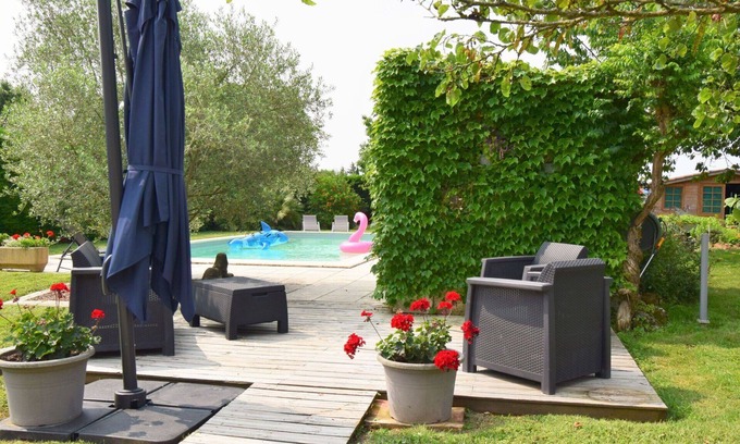 "L'Ostalet de Sarron" is a beautiful country house located in Brax, France. It offers a private swimming pool with an internal staircase and alarm system, a pergola, terrace, garden furniture, and parking for two cars on the premises. The property also features a yard, internet WiFi, and is within proximity to shops, supermarkets, restaurants, and bakeries.