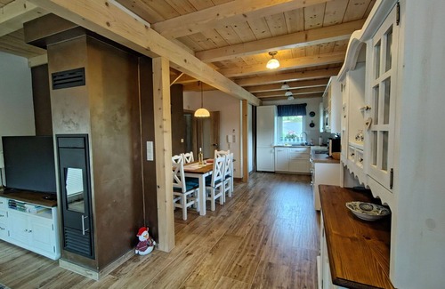 The cottage is outfitted with various amenities such as electric heating, wood heating, and floor heating for your comfort during your vacation. Outdoor spaces include a terrace with terrace furniture, allowing you to enjoy the fresh air. Convenient appliances like a washing machine are provided for your convenience. Furthermore, internet access is available through free WiFi connectivity.