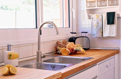 The well-appointed kitchen is fully equipped with an oven, dishwasher, three ceramic glass hob hotplates, toaster, kettle, microwave, freezer, and an electric coffee machine, ensuring you have everything you need for preparing delicious meals. Other amenities include a washing machine, safe, iron, mosquito net, children's high chair, baby cot for up to 2-year-olds, and a hair dryer. You can also enjoy complimentary WiFi internet access and reserved parking during your stay.