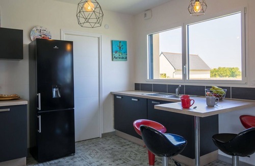 Modern single-family house "L'Hippocampe", built in 2018. In the district of Pors Guen 4 km from the centre of Plouescat, 9 km from the centre of Cléder, 18 km from the centre of Lesneven, 150 m from the sea, 200 m from the beach. Private: property 500 m2 (fenced) with lawn and wildlife garden. Storeroom available. Parking (for 2 cars, limited number of spaces). Carport. Shop 4 km, supermarket 3.6 km, restaurant 100 m, bakery 4 km, sandy beach "Plage de Pors Meur" 700 m, thermal baths "Thalasso Roscoff" 23 km. Golf course (9 hole) 6 km, surf school, sailing school 240 m, tennis 1 km, minigolf 2 km, walking paths from the house 150 m. Nearby attractions: Char à voile, baie du Kernic 1.4 km, Reserve ornithologique Dunes de Keremma 10 km, Châteáu de Kerjean 14 km, Roscoff et Jardin Exotique, Île de Batz 23 km, Morlaix 36 km, Océanopolis Brest 57 km. Hiking paths: GR34 150 m.