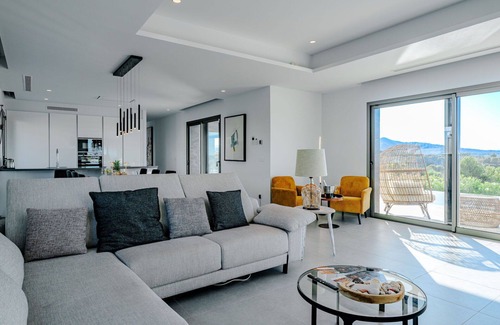 The villa offers a marvellous panoramic view of the mountains and the valley, creating a stunning backdrop for your vacation. It also includes modern facilities such as a washing machine, dryer, iron, children's high chair, baby cot, and hair dryer. You can enjoy complimentary internet access with WiFi throughout the property. The villa has a garage that can accommodate two cars. One pet or dog is allowed on the premises, making it a pet-friendly environment for your family vacation.