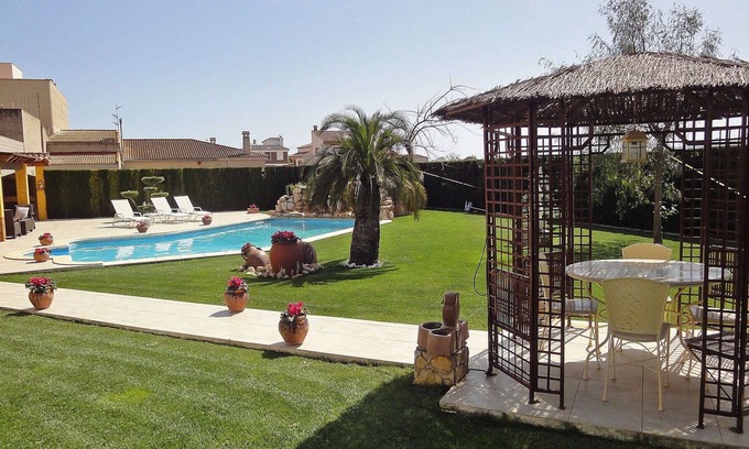 L'Aldea 8 km from L'Ampolla: Rental bikes: 20€ per week. Large, very beautiful house "L'Aldea", detached. 8 km from the sea, 8 km from the beach. Private: beautiful, well-kept garden 600 m2 (fenced) with lawn, swimming pool kidney shaped (10 x 4 m, depth 90 - 180 cm, seasonal availability: 01.Jan. - 31.Dec.) with internal staircase. Outdoor shower, arbour, pergola, garden furniture, barbecue. In the house: air conditioning, burglar alarm system, bicycles available (extra). Public parking on the road. Shop 300 m, supermarket 1 km, restaurant 300 m.