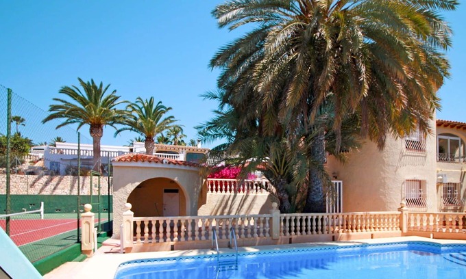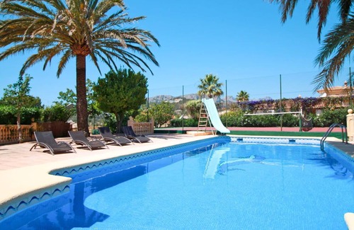 Villa "Tenis Janka" is a vacation rental situated in Benissa, Spain. It offers a range of amenities including a private swimming pool (9 x 4 m, depth 120 - 220 cm, seasonal availability: 01.Jan. - 31.Dec.), a slide, an outdoor shower, a tennis court, a terrace, a barbecue area, and parking on the premises. The property boasts a fenced area of 1'587 m2, providing ample space for outdoor relaxation and activities.