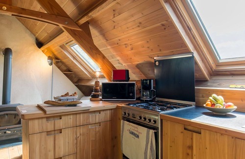 This cozy 1-room apartment, spanning 55 m2, is suitable for a vacation stay of up to 2 adults and 1 child. The apartment features a renovated interior with a wooden and Scandinavian-inspired design, completed in 2019. The living/dining area boasts sloping ceilings with a rooflight, complemented by a Scandinavian wood stove, a dining table, a satellite TV with international channels, a radio, and a DVD player. Additionally, there is an open room with sloping ceilings and a rooflight, accommodating a single bed (80 cm, length 190 cm), a French bed (180 cm, length 200 cm), a hand basin, and a shower. The kitchen is open-concept and well-equipped with an oven, 4 gas rings, a toaster, a kettle, a microwave, and an electric coffee machine. There is also a separate WC. The floors are made of parquet, and the property offers electric heating.