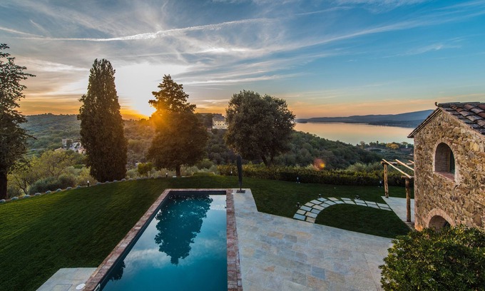 Villa La Colognola is an authentic farmhouse perched on the gentle Umbrian hills and, thanks to its position, offers an exclusive view of the enchanting Lake Trasimeno. The place offers an oasis of peace and relaxation, a perfect retreat for a pleasant holiday, in which the comfort of a luxury resort is combined with the strategic and suggestive position. With its 5 bedrooms, each decorated in soft colors, the Villa is an authentic Umbrian jewel in a relaxing and welcoming environment. The Master Suite is located in the Depandance, once the property's barn. The large double bed dominates the room, the characteristic windows flood the room with a splendid natural light and offer a view as far as the eye can see on Lake Trasimeno and its horizon. The Suite has a bathroom with a double sink and a Jacuzzi. In the main body of the villa there is a double bedroom and a bathroom with shower on the ground floor, while on the first floor, with access via authentic external steps, there are the other three bedrooms. Two bedrooms are double and share a spacious bathroom with double sinks and a shower with hydromassage. The last room is instead composed of two "French" beds and a private bathroom with a shower cabin. All rooms overlook the lovely living room where the authentic still functioning fireplace dominates, around which there are comfortable sofas and armchairs. The kitchen, modern, functional and equipped with everything you need is located on the ground floor. Here, in a single large room interspersed with arches, are the dining area and living room with plasma TV and comfortable sofa. The villa offers guests a SPA area with sauna and emotional shower, ideal for relaxing in the cold winter months or purifying in the summer after a long day of hiking. The modern outdoor pool is 10 meters long and is situated in an enchanting position with a 360 degree view of the lake and the surrounding hills. Just 500 meters away, reachable by a pleasant walk, you can reach a Bottega di Generi Alimentari, while the nearest town is only two and a half kilometers away. Elegance, luxury, authenticity make Villa La Colognano the ideal destination for your exclusive holiday!