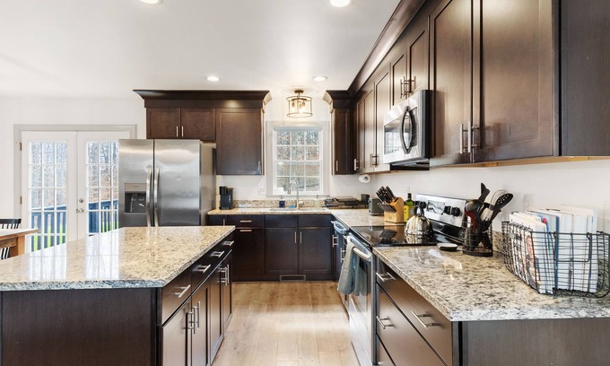 Step into your cozy retreat with an open living area offering a spacious couch, leather chair, and a smart TV. While we don’t offer cable, each TV is equipped with built-in Roku for watching all of your guilty pleasures. Go ahead, binge-watch your favorite show, no judgment here! The kitchen is stocked with cookware, a Keurig coffee maker, and some of our favorite cookbooks. A convenient half bathroom houses the washer and dryer, while the pantry is stocked with board games and cards for your entertainment.
