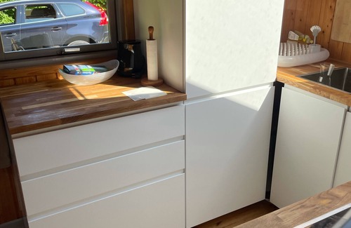 The house has two bedrooms (1 bed 160x200, 1 bunk bed). A living / dining room with open kitchen and a Schwedendkamin complete this room. In the bathroom, there is a washing machine and a glass-enclosed shower.