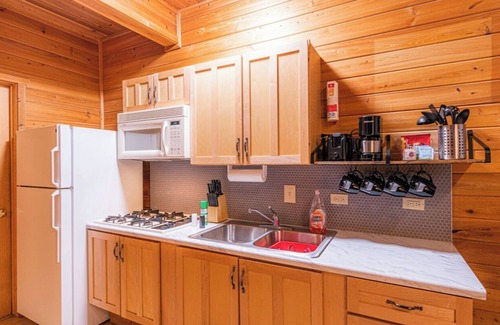 Cabins are completely furnished. Each cabin has a bedroom, and a loft with made beds, full bath with towels provided. Living area completed with Wifi access (Password will be provided upon check in), a flat screen tv connected to satellite (please note satellite may lose signal during inclement weather), window a/c, heat. Kitchen with full size refrigerator, stove top range (no oven), microwave, toaster, coffee maker and dishes including: pots, pans, plates, cups, saucers, bowls, and silverware.