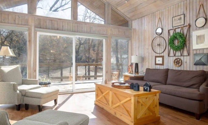 Beautiful Secluded Log Home with hot tub for up to 10 guests. The property is located close to the Arbuckle Lake's Guy Sandy boat ramp, yet secluded and tucked away in a valley surrounded by trees. This is the perfect getaway for those looking for a secluded property but still want to enjoy the area attractions within a short drive. In addition to plenty of trees, the property features a natural spring and a dry creek. The open kitchen, with quartz countertops, and family room as well as the sunroom provide great views of the woods. Listen to the sounds of nature, watch the wildlife or just relax with a cup of coffee on the wrap-around outdoor deck or enjoy the evening in our new large hot tub. Inside you will find hard surface flooring, farmhouse style decor, a large farm table to gather around. Three bedrooms with two queen beds and two twins, plus a sleeper sofa in one of the living areas plus two roll away beds provide sleeping accommodations for up to10 guests. Two full bathrooms are available to take care of your hygiene needs. This unit has a 4 ton HVAC system.so you will not have to worry about being cool on hot summer days