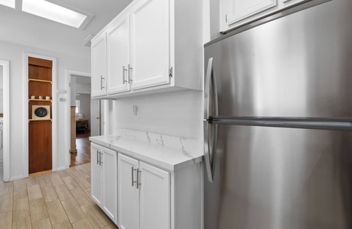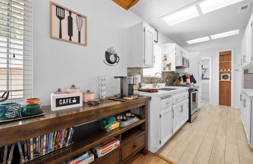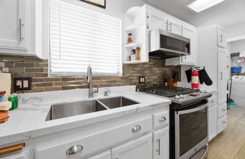 KITCHEN - Stainless steel appliances, Quartz countertops, stove with oven, refrigerator, dishwasher, Air fryer, microwave, blender, toaster, Keurig, coffee maker, dishes, pots/pans, and more.