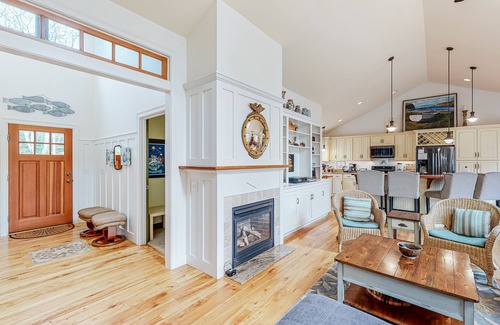 Four can share morning coffee at the butcher block kitchen bar. Then, settle in on the comfy sectional and screen a new film on the TV in the sun-soaked Great room, a social space with cathedral ceilings and a gas fireplace. Downstairs, the den is stocked with books and games. Comfy furniture, a desk, and a table offer plenty of space to socialize or read. A second living room is ideal for fun-filled game nights with a pool table, foosball, and ping-pong.